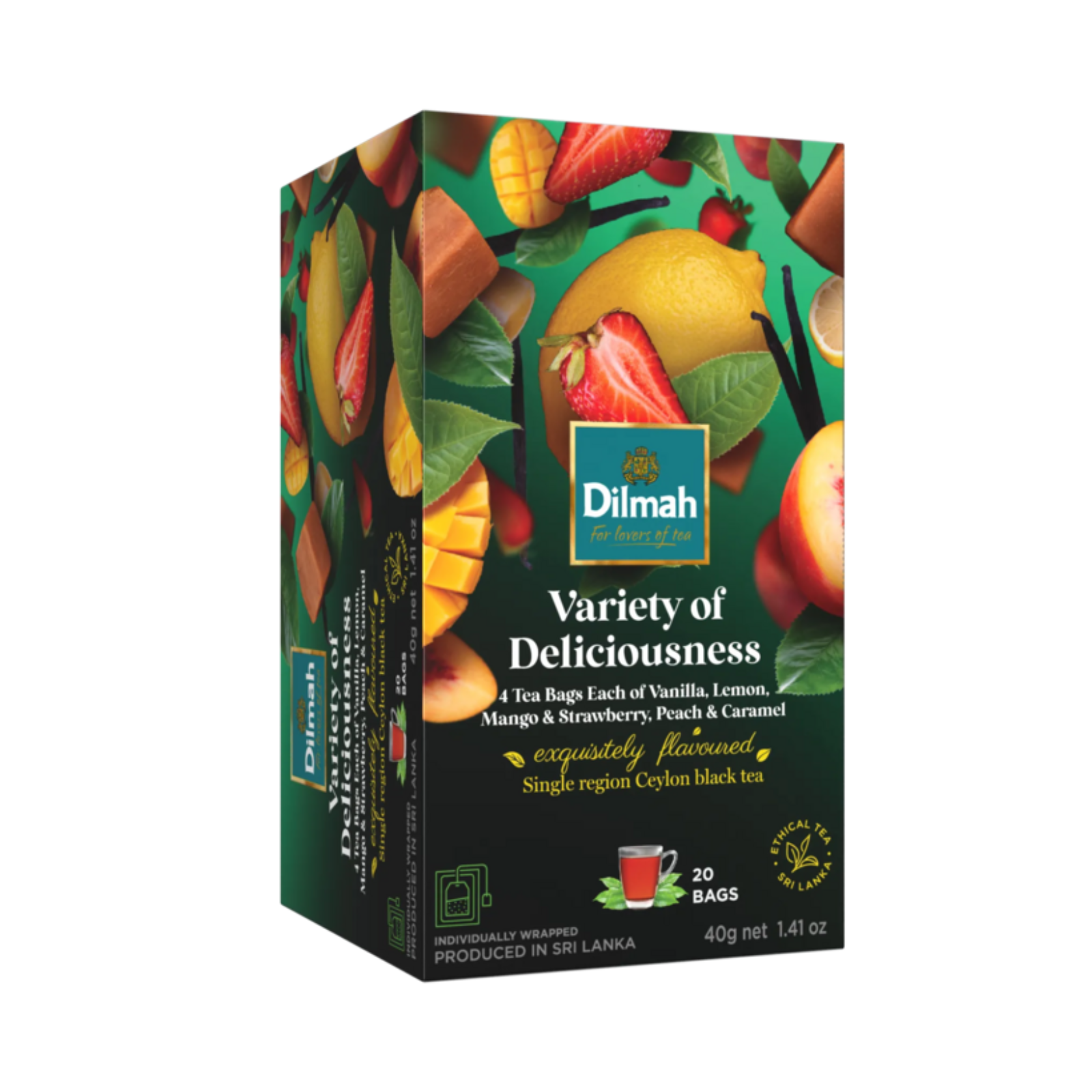 A variety pack containing 4 tea bags each of Vanilla, Lemon, Mango & Strawberry, Peach and Caramel flavoured Teas.