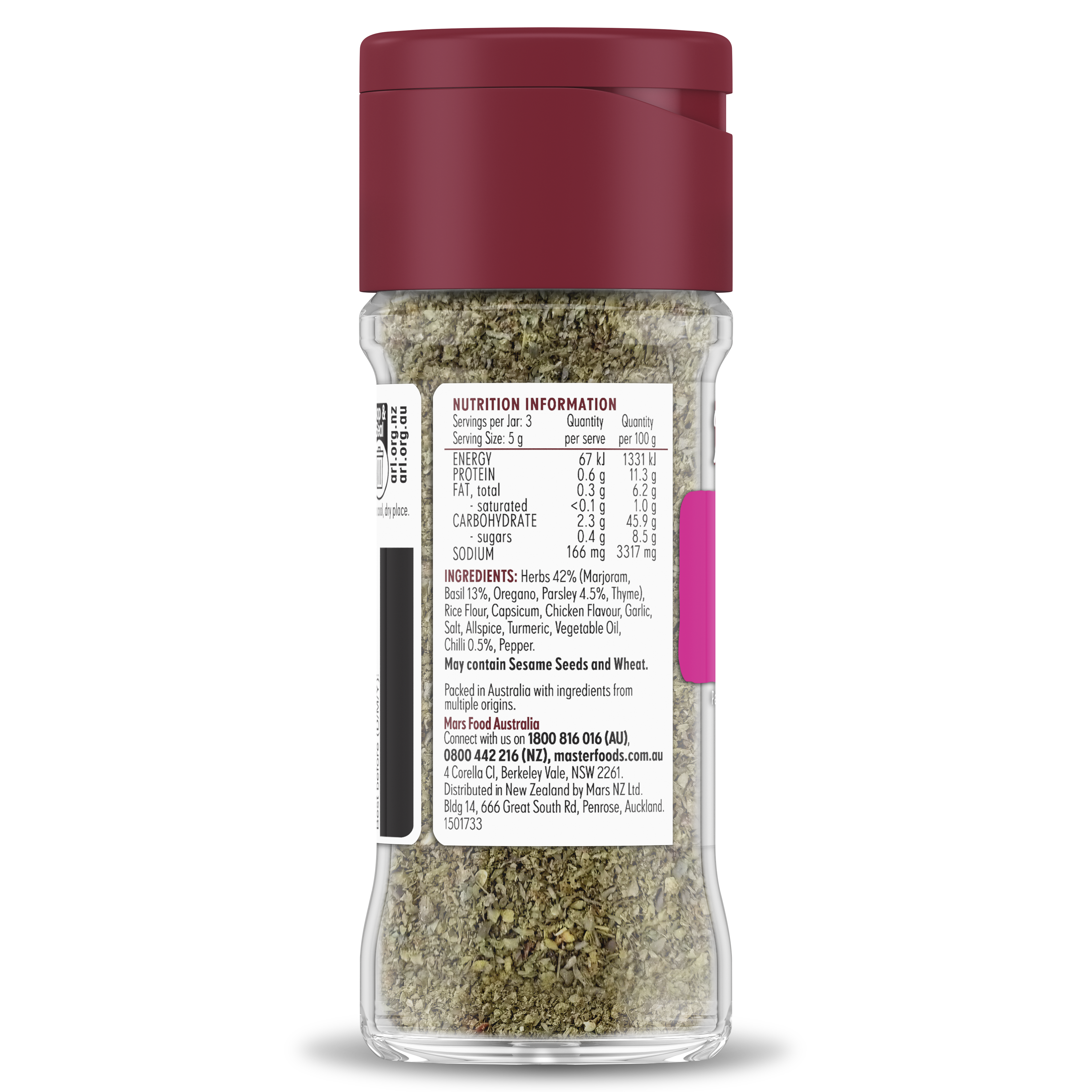 Herbs 42% (marjoram, Basil 13%, Oregano 8%, Parsley, Thyme), Rice Flour, Capsicum, Chicken Flavour, Garlic 6%, Salt, Allspice, Turmeric, Vegetable Oil, Chilli 0.5%, Pepper.